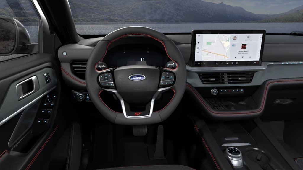 Inside, the Explorer ST is just as focused. It features leather sport seating with "ST" badging, contrast stitching, and optional multicontour seats with massage function. Seating for six and a PowerFold third row help balance everyday practicality with comfort.