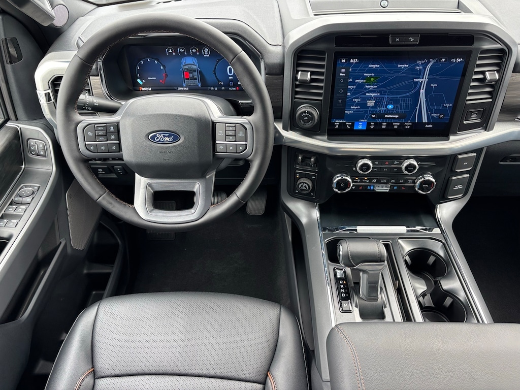 F-150 4WD, 4 Pickup Box Tie-Down Plates, 4-Wheel Disc Brakes, 4x4 FX4 Off-Road Bodyside Decal, 6" Angular Bright Anodized Step Bar, 6" Extended Running Boards, 8 Speakers, ABS brakes, ActiveX Trimmed Bucket Seats, Adjustable pedals, Air Conditioning, Alloy wheels, AM/FM radio: SiriusXM with 360L, Auto High-beam Headlights, Auto-dimming door mirrors, Auto-dimming Rear-View mirror, Automatic temperature control, Bed Utility Package, Brake assist, Bumpers: chrome, Chrome wheels, Compass, Console Worksurface, Cruise Control, Delay-off headlights, Driver door bin, Driver vanity mirror, Dual front impact airbags, Dual front side impact airbags, Electronic Stability Control, Emergency communication system: SYNC 4 911 Assist, Equipment Group 501A Mid, Front anti-roll bar, Front Bucket Seats, Front Center Armrest, Front dual zone A/C, Front fog lights, Front License Plate Bracket, Front reading lights, Front wheel independent suspension, Fully automatic headlights, FX4 Off-Road Package, Garage door transmitter, Heated and Cooled Seats, Heated door mirrors, Heated steering wheel, Hill Descent Control, Illuminated Driver & Passenger Visors, Illuminated entry, LED Box Lighting, Low tire pressure warning, Memory seat, Mobile Office Package, Monotube Rear Shocks, Navigation system: Connected Navigation, Occupant sensing airbag, Off-Road Tuned Front Shock Absorbers, Outside temperature display, Overhead airbag, Overhead console, Panic alarm, Partitioned Lockable Rear Storage, Passenger door bin, Passenger vanity mirror, Pedal memory, Power door mirrors, Power driver seat, Power passenger seat, Power steering, Power Tailgate, Power windows, Power-Sliding Rear Window, Pro Access Tailgate, Radio data system, Radio: B&O Sound System by Bang & Olufsen, Rain sensing wipers, Rear reading lights, Rear seat center armrest, Rear step bumper, Rear window defroster, Remote keyless entry, Rock Crawl Mode, Security system, Split folding rear seat, Steering wheel mounted audio controls, SYNC 4 w/Enhanced Voice Recognition, Tachometer, Telescoping steering wheel, Tilt steering wheel, Tow/Haul Package, Traction control, Tray Style Floor Liner w/o Carpet Mats, Trip computer, Turn signal indicator mirrors, Twin Panel Moonroof, Variably intermittent wipers, Ventilated front seats, Voltmeter, Wheels: 18" Chrome-Like PVD, Wheels: 20" Chrome-Like PVD, Wireless Charging, (Must finance with Ford Motor Credit to receive online pricing - see dealer for details.) Proudly, 4WD. Lariat