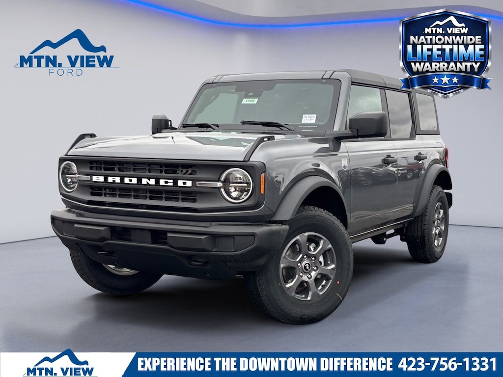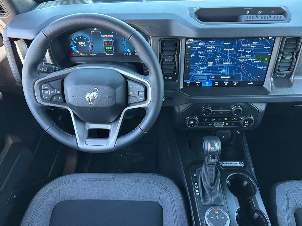 Bronco 2-Door Intelligent Access with Lock/Unlock, 4-Wheel Disc Brakes, 4.46 Axle Ratio, 7 Speakers, ABS brakes, Air Conditioning, Alloy wheels, AM/FM radio: SiriusXM with 360L, AM/FM Stereo, Ambient Footwell Lighting, Auto High-Beam Headlamps, Auto High-beam Headlights, BLIS Blind Spot Information System, Brake assist, Carbonized Gray Molded-in-Color Hard Top, Cloth Bucket Seats, Compass, Connected Navigation, Cruise Control, Delay-off headlights, Driver and Front Passenger Illuminated Sliding Visor Vanity Mirrors, Driver door bin, Driver vanity mirror, Dual front impact airbags, Dual front side impact airbags, Dual Smart Charging USB Ports, Dual-Zone Electronic Automatic Temperature Control, Electronic Stability Control, Emergency communication system: 911 Assist, Equipment Group 222A Mid Package, Ford Connectivity Package (1-Year Included), Front anti-roll bar, Front Bucket Seats, Front Center Armrest, Front reading lights, Front Row Heated Seats, Front wheel independent suspension, Fully automatic headlights, Hard Top Sound Deadening Headliner, Heated door mirrors, Illuminated entry, Integrated roll-over protection, Lane-Keeping System, Low tire pressure warning, Occupant sensing airbag, Outside temperature display, Overhead airbag, Overhead console, Panic alarm, Passenger door bin, Passenger vanity mirror, Power door mirrors, Power steering, Power windows, Pre-Collision Assist with Automatic Emergency Braking, Pro Power Onboard - 400W, Radio data system, Rear Parking Sensors, Rear-View Camera, Rear-Window Defroster and Washer, Rearview Camera, Remote keyless entry, Security system, SiriusXM with 360L, Split folding rear seat, Steering wheel mounted audio controls, SYNC 4, Tachometer, Telescoping steering wheel, Tilt steering wheel, Traction control, Trip computer, Variably intermittent wipers, Wheels: 17" Carbonized Gray-Painted Aluminum, (Must finance with Ford Motor Credit to receive online pricing - see dealer for details.) Proudly. Big Bend