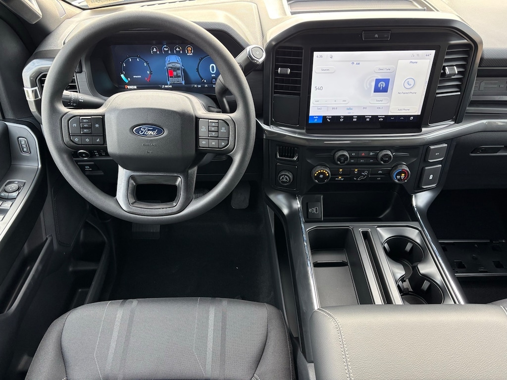 F-150 12" Cluster Display, 4-Wheel Disc Brakes, 6 Speakers, ABS brakes, Air Conditioning, Alloy wheels, AM/FM radio: SiriusXM with 360L, Auto High-beam Headlights, Brake assist, Bumpers: body-color, Compass, Cruise Control, Delay-off headlights, Driver door bin, Dual front impact airbags, Dual front side impact airbags, Electronic Stability Control, Emergency communication system: SYNC 4 911 Assist, Equipment Group 200A Mid, Ford Connectivity Package (1-Year Included), Front anti-roll bar, Front Bucket Seats, Front Center Armrest, Front License Plate Bracket, Front reading lights, Front wheel independent suspension, Fully automatic headlights, GVWR: 6,426 lbs Payload Package, Heated door mirrors, Illuminated entry, Internet access capable: 5G Modem - Ford Connectivity Package, LED Fog Lamps with LED Cornering Lamp, Low tire pressure warning, Occupant sensing airbag, Outside temperature display, Overhead airbag, Overhead console, Panic alarm, Passenger door bin, Passenger vanity mirror, Power door mirrors, Power steering, Power windows, Radio data system, Radio: AM/FM Stereo with SiriusXM 360L, Rear Parking Sensors, Rear step bumper, Rear window defroster, Remote keyless entry, Security system, Split folding rear seat, Steering wheel mounted audio controls, SYNC 4 with Enhanced Voice Recognition, Tachometer, Telescoping steering wheel, Tilt steering wheel, Traction control, Trip computer, Unique Sport Cloth 40/Console/40 Front-Seats, Variably intermittent wipers, Wheels: 18" Gloss Black, Wheels: 20" Dark Gray Aluminum, (Must finance with Ford Motor Credit to receive online pricing - see dealer for details.) Proudly. STX