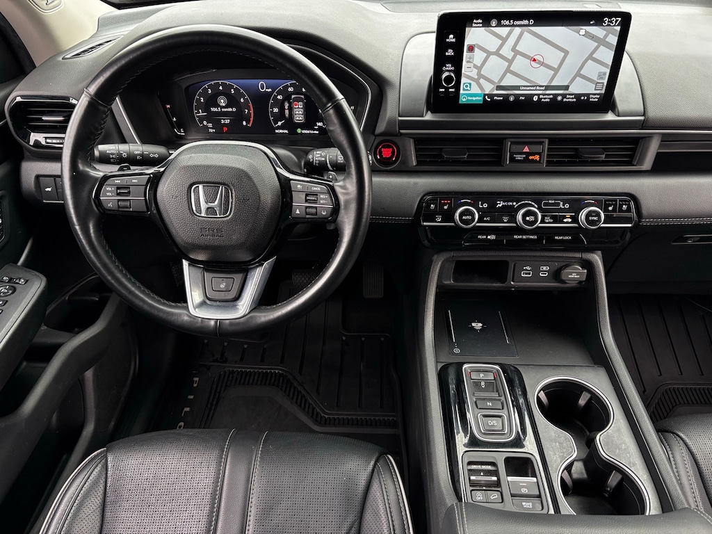 2025 Honda Pilot Elite AWD, 12 Speakers, 3rd row seats: split-bench, 4-Wheel Disc Brakes, 4.167 Axle Ratio, ABS brakes, Adaptive Cruise Control: Adaptive Cruise Control (ACC) with Low-Speed Follow, Air Conditioning, Alloy wheels, AM/FM radio: SiriusXM, Apple CarPlay/Android Auto, Auto High-beam Headlights, Auto-dimming door mirrors, Auto-dimming Rear-View mirror, Automatic temperature control, Blind Spot Information (BSI) System warning, Bose Premium Sound System, Brake assist, Bumpers: body-color, Compass, Cruise Control, Delay-off headlights, Driver door bin, Driver vanity mirror, Dual front impact airbags, Dual front side impact airbags, Electronic Stability Control, Emergency communication system: HondaLink, Four wheel independent suspension, Front anti-roll bar, Front Bucket Seats, Front Center Armrest, Front dual zone A/C, Front fog lights, Front reading lights, Fully automatic headlights, Garage door transmitter: HomeLink, Heads-Up Display, Heated and Cooled Seats, Heated and Ventilated Front Bucket Seats, Heated door mirrors, Heated rear seats, Heated steering wheel, Honda Satellite-Linked Navigation System, HondaLink Subscription Services, Illuminated entry, Knee airbag, Lane departure: Lane Keeping Assist System (LKAS) active, Low tire pressure warning, Memory seat, Navigation system: Honda Satellite-Linked Navigation System, Occupant sensing airbag, Outside temperature display, Overhead airbag, Overhead console, Panic alarm, Passenger door bin, Passenger vanity mirror, Perforated Leather Seat Trim, Power door mirrors, Power driver seat, Power Liftgate, Power moonroof, Power passenger seat, Power steering, Power windows, Radio data system, Rain sensing wipers, Rear air conditioning, Rear anti-roll bar, Rear reading lights, Rear seat center armrest, Rear window defroster, Rear window wiper, Rearview Camera, Reclining 3rd row seat, Remote keyless entry, Security system, SiriusXM, Speed-sensing steering, Speed-Sensitive Wipers, Split folding rear seat, Spoiler, Steering wheel mounted audio controls, Tachometer, Telescoping steering wheel, Tilt steering wheel, Traction control, Trip computer, Turn signal indicator mirrors, Variably intermittent wipers, Ventilated front seats, Wheels: 20 Shark Gray Machine Face with Black Lug Nuts, (Must finance with Ford Motor Credit to receive online pricing - see dealer for details.) Proudly, AWD. Black 10-Speed Automatic