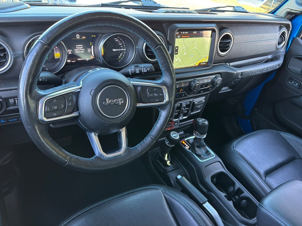 2021 Jeep Wrangler Unlimited Rubicon 4xe Wrangler Unlimited Rubicon 4xe, 4D Sport Utility, 2.0L I4 DOHC, 8-Speed Automatic, 4WD, Hydro Blue Pearl Coat, Black Leather, Cold Weather Group, Heated Front Seats, Heated Steering Wheel, Quick Order Package 29V, Remote Start System, Steel Bumper Group, Steel Front Bumper, Steel Rear Bumper, 4-Wheel Disc Brakes, 4.10 Rear Axle Ratio, 9 Speakers, ABS brakes, Air Conditioning, Alloy wheels, AM/FM radio: SiriusXM, Apple CarPlay/Android Auto, Auto-dimming Rear-View mirror, Automatic temperature control, Body Color 3-Piece Hard Top, Body Color Fender Flares, Brake assist, Compass, Cruise Control, Delay-off headlights, Driver door bin, Driver vanity mirror, Dual front impact airbags, Dual front side impact airbags, Electronic Stability Control, Emergency communication system: SiriusXM Guardian, Freedom Panel Storage Bag, Front anti-roll bar, Front Bucket Seats, Front Center Armrest w/Storage, Front dual zone A/C, Front fog lights, Front License Plate Bracket, Front reading lights, Fully automatic headlights, Garage door transmitter, Heated door mirrors, Illuminated entry, Integrated Off-Road Camera, Integrated roll-over protection, Leather steering wheel, Low tire pressure warning, MOPAR Satin Black Grille, Navigation System, Occupant sensing airbag, Outside temperature display, Panic alarm, ParkView Rear Back-Up Camera, Passenger door bin, Passenger vanity mirror, Performance Suspension, Power door mirrors, Power steering, Power windows, Premium Cloth Low-Back Bucket Seats, Radio data system, Radio: Uconnect 4C Nav w/8.4 Display, Rear anti-roll bar, Rear reading lights, Rear Window Defroster, Rear Window Wiper/Washer, Remote keyless entry, Remote Proximity Keyless Entry, Security system, Split folding rear seat, Steering wheel mounted audio controls, Tachometer, Telescoping steering wheel, Tilt steering wheel, Traction control, Trip computer, Variably intermittent wipers, Voltmeter, Wheels: 17 x 7.5 Machined/Painted Black, (Must finance with Ford Motor Credit to receive online pricing - see dealer for details.) Proudly, Wrangler Unlimited Rubicon 4xe, 4D Sport Utility, 2.0L I4 DOHC, 8-Speed Automatic, 4WD, Hydro Blue Pearl Coat, Black Leather, Cold Weather Group, Heated Front Seats, Heated Steering Wheel, Quick Order Package 29V, Remote Start System, Steel Bumper Group, Steel Front Bumper, Steel Rear Bumper. Hydro Blue Pearl Coat 8-Speed Automatic Clean CARFAX.